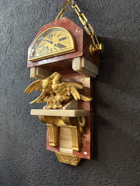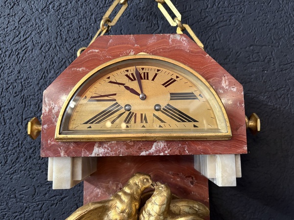 decorative vintage wall clock in Neoclassical Revival style, likely dating from the early to mid-20th century. It features fine materials and rich ornamental symbolism, making it as much a sculptural artwork as a timepiece.