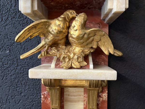 A pair of gilded doves or lovebirds, sitting on a floral nest — a classical symbol of love, fidelity, and harmony