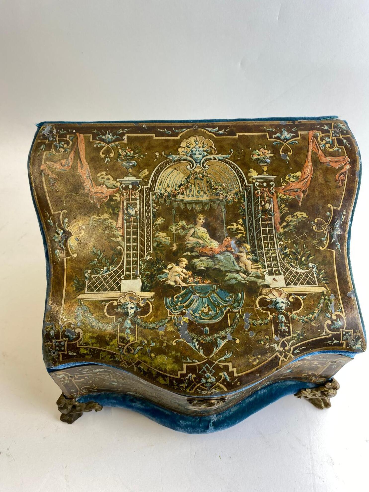 The centerpiece on the lid features a noblewoman reclining under a canopied structure, surrounded by cherubs and garden elements.