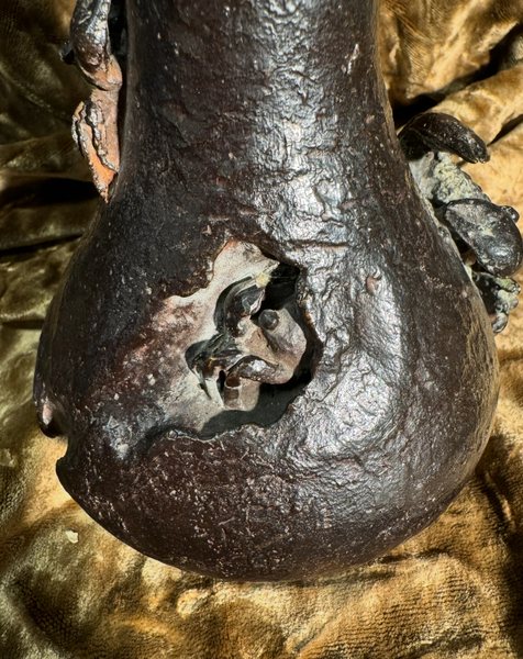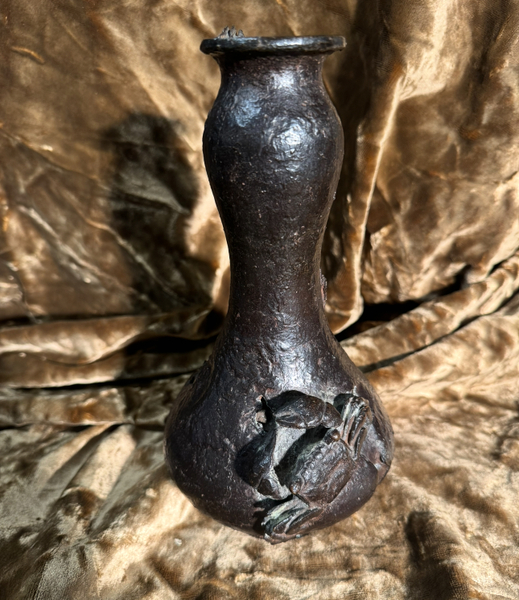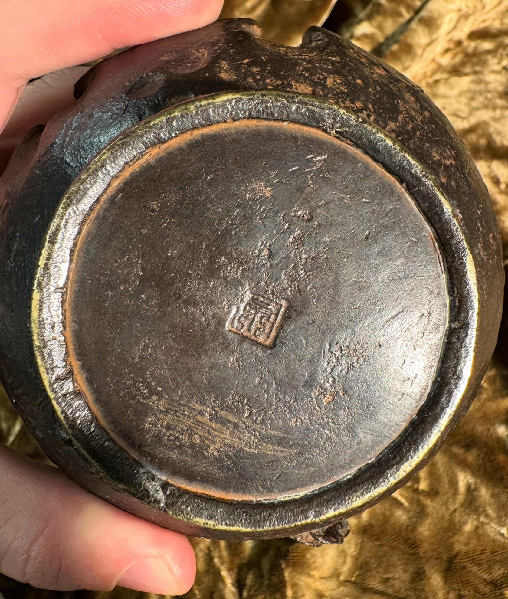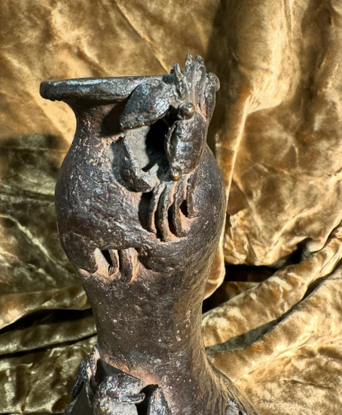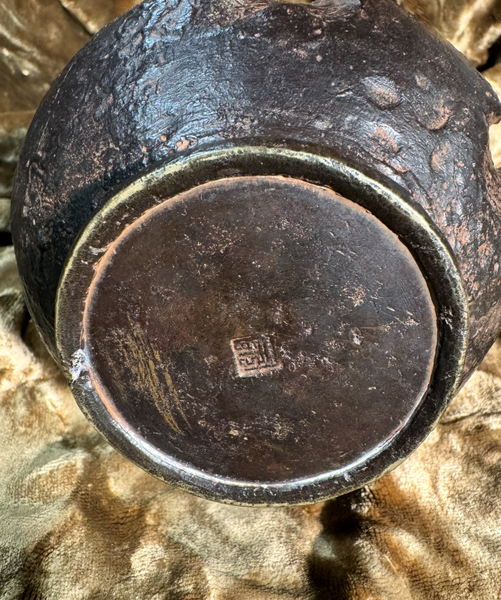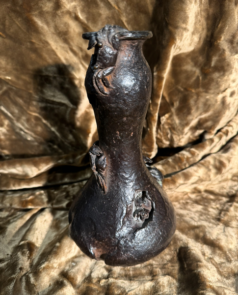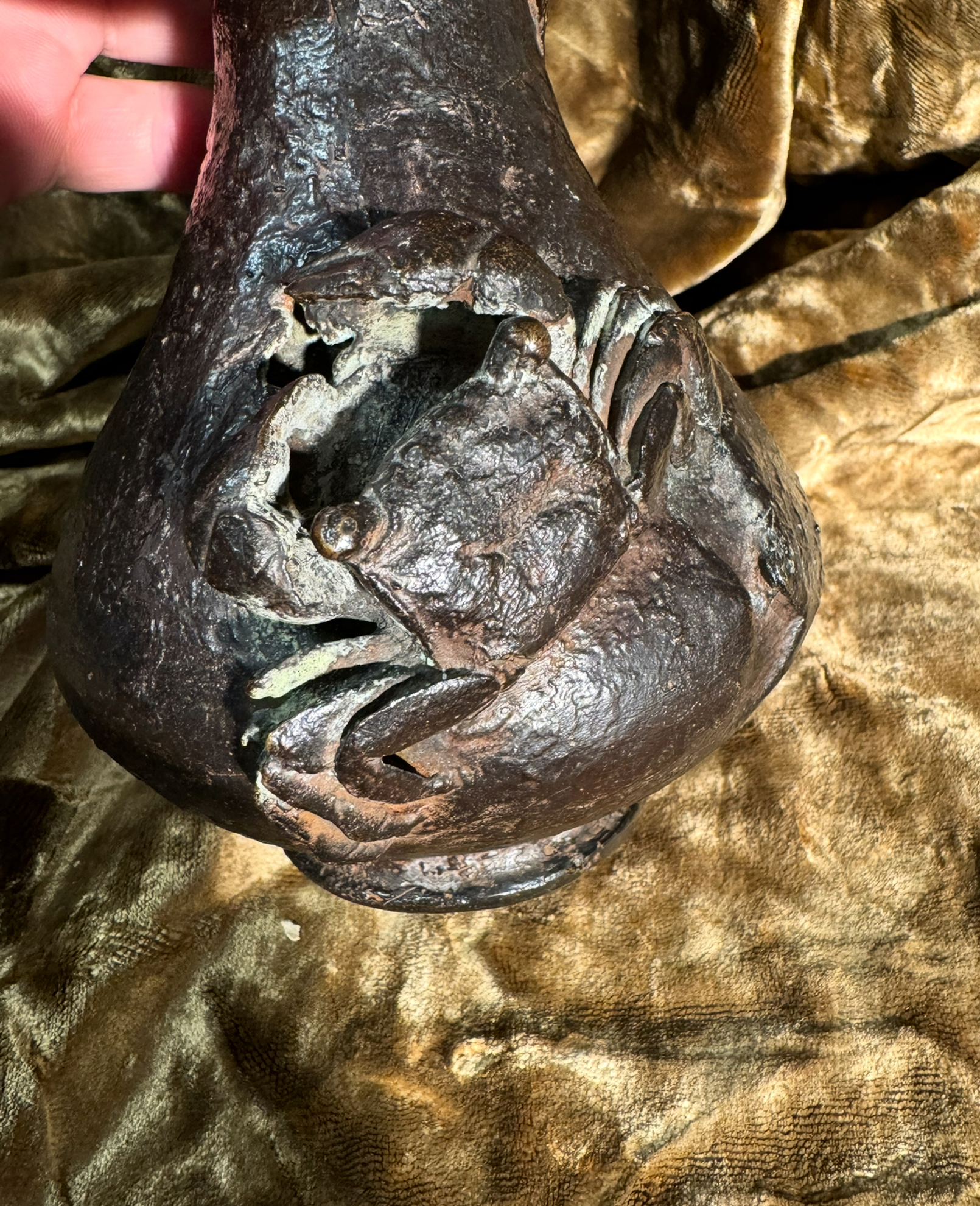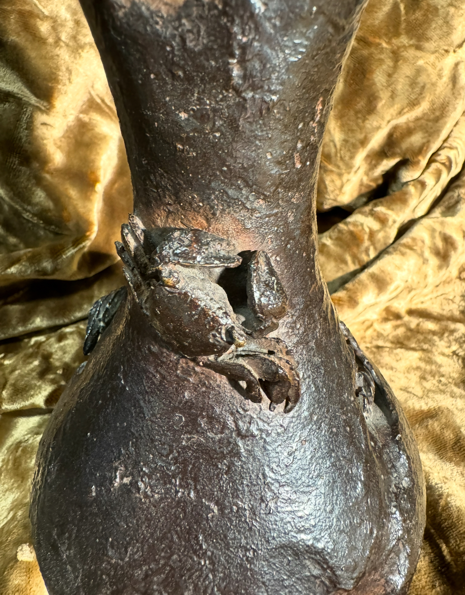 This Japanese bronze vase features a unique design that evokes the beauty of the marine world. Its shape resembles that of a submerged vase, adorned with crabs that appear to climb its surface and explore its openings. The delicate details of the crustaceans bring a touch of life to the piece, highlighting the harmony between art and nature. At the base, a seal attests to the authenticity of the work and its Japanese origin, adding historical value to this fascinating piece.