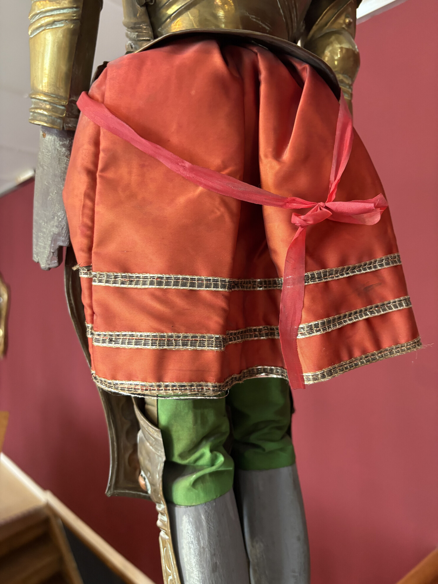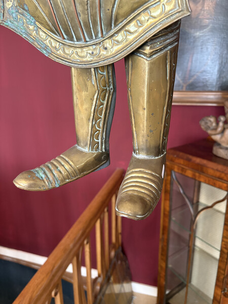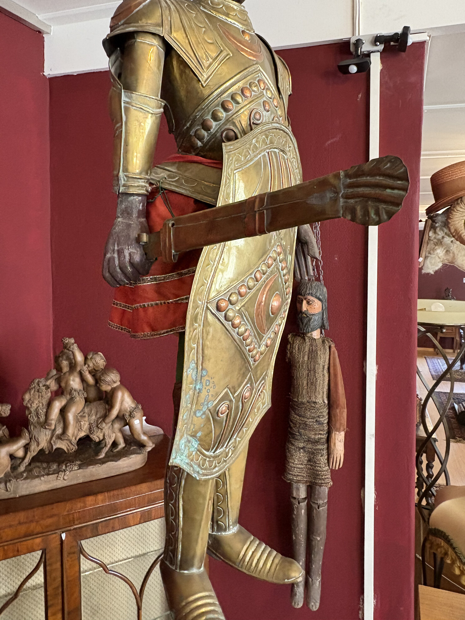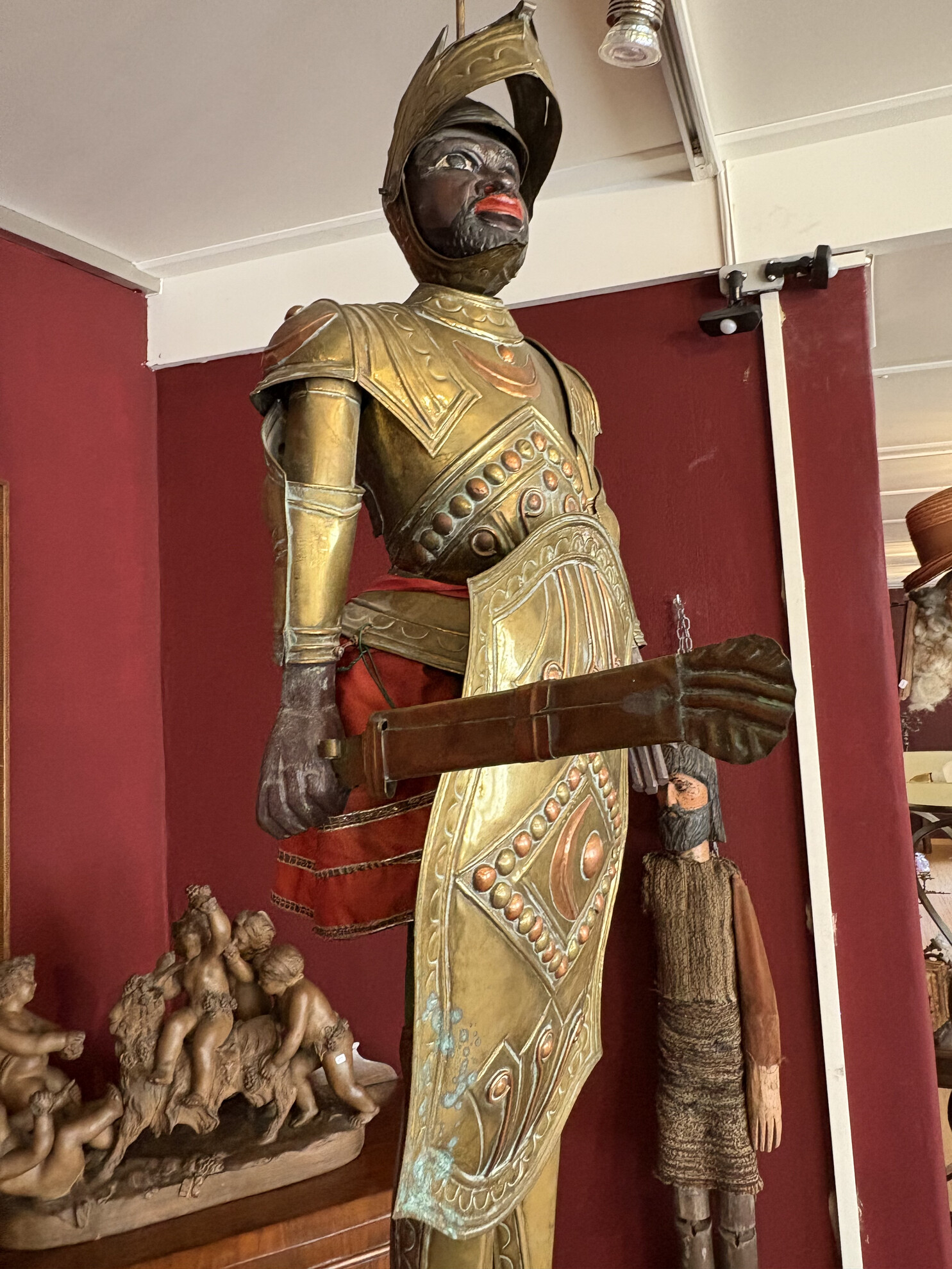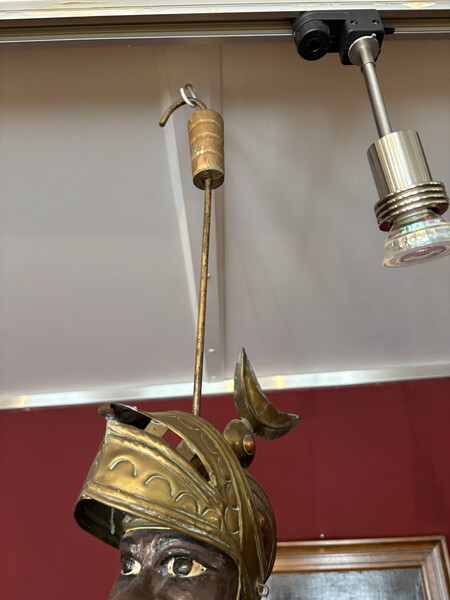 Large Sicilian marionette (Opera dei Pupi), traditionally used in puppet theatre popular in southern Italy, especially Sicily and Naples. These puppets represent medieval knights and are dressed in ornate armor, often referencing the tales of Charlemagne and his paladins.