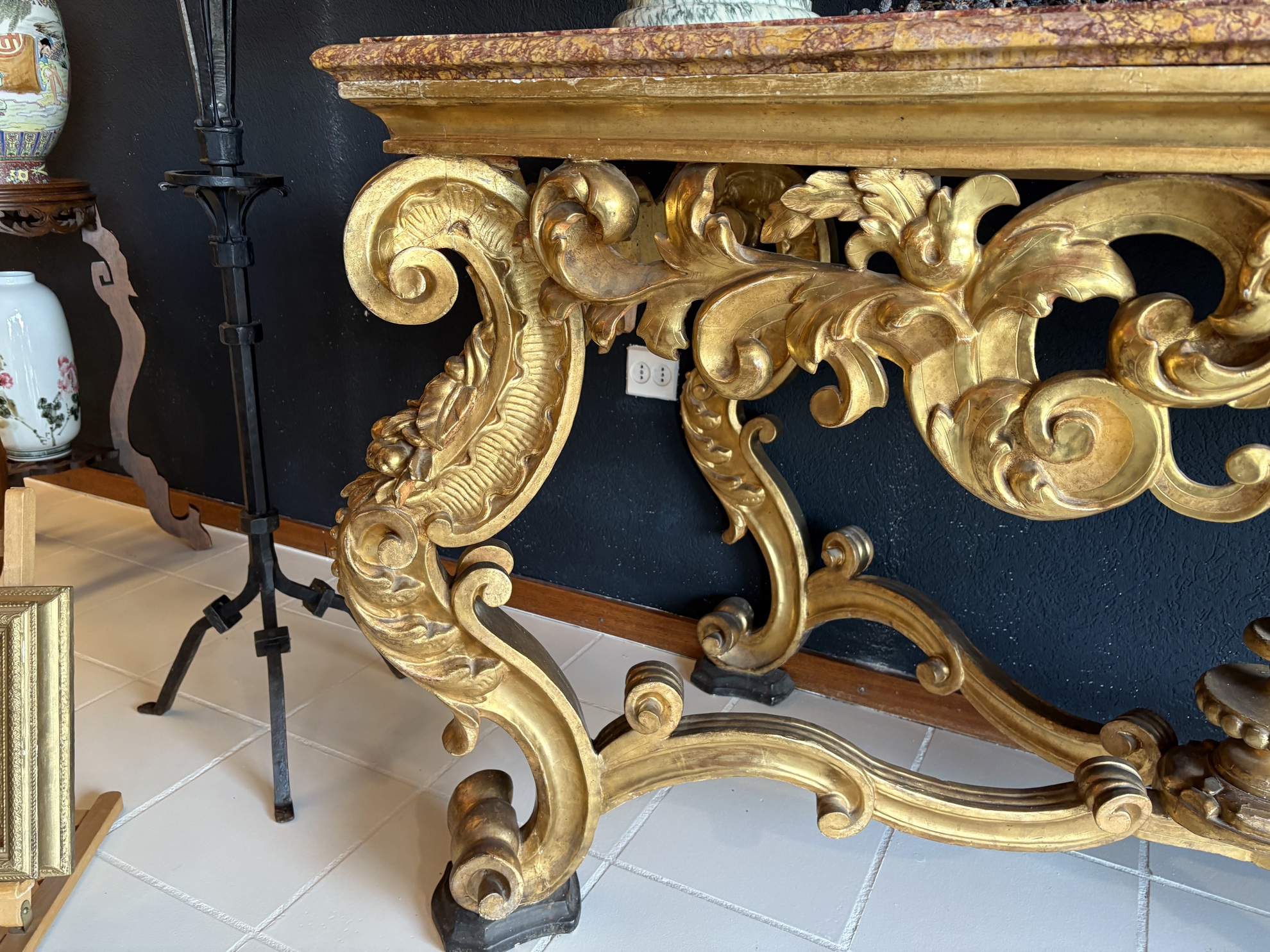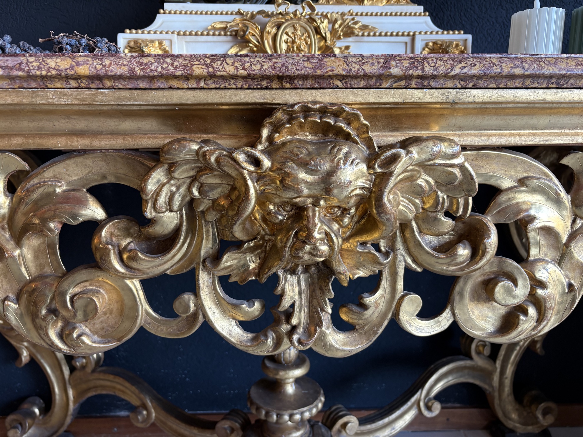 Massive richly veined marble top in tones of deep red and cream, complementing the gold leaf frame.