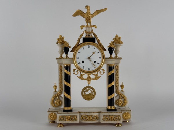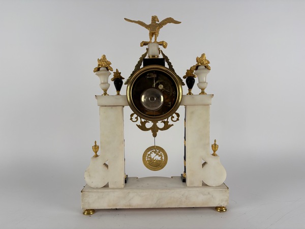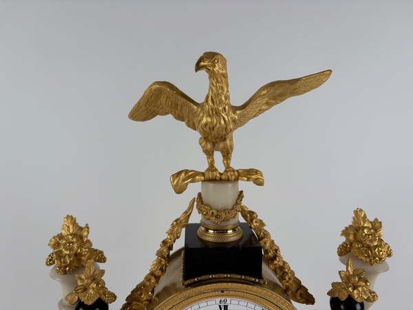 Top: The top of the clock is decorated with a gilded eagle, a common symbol in the Empire style, which radiates power and grandeur.