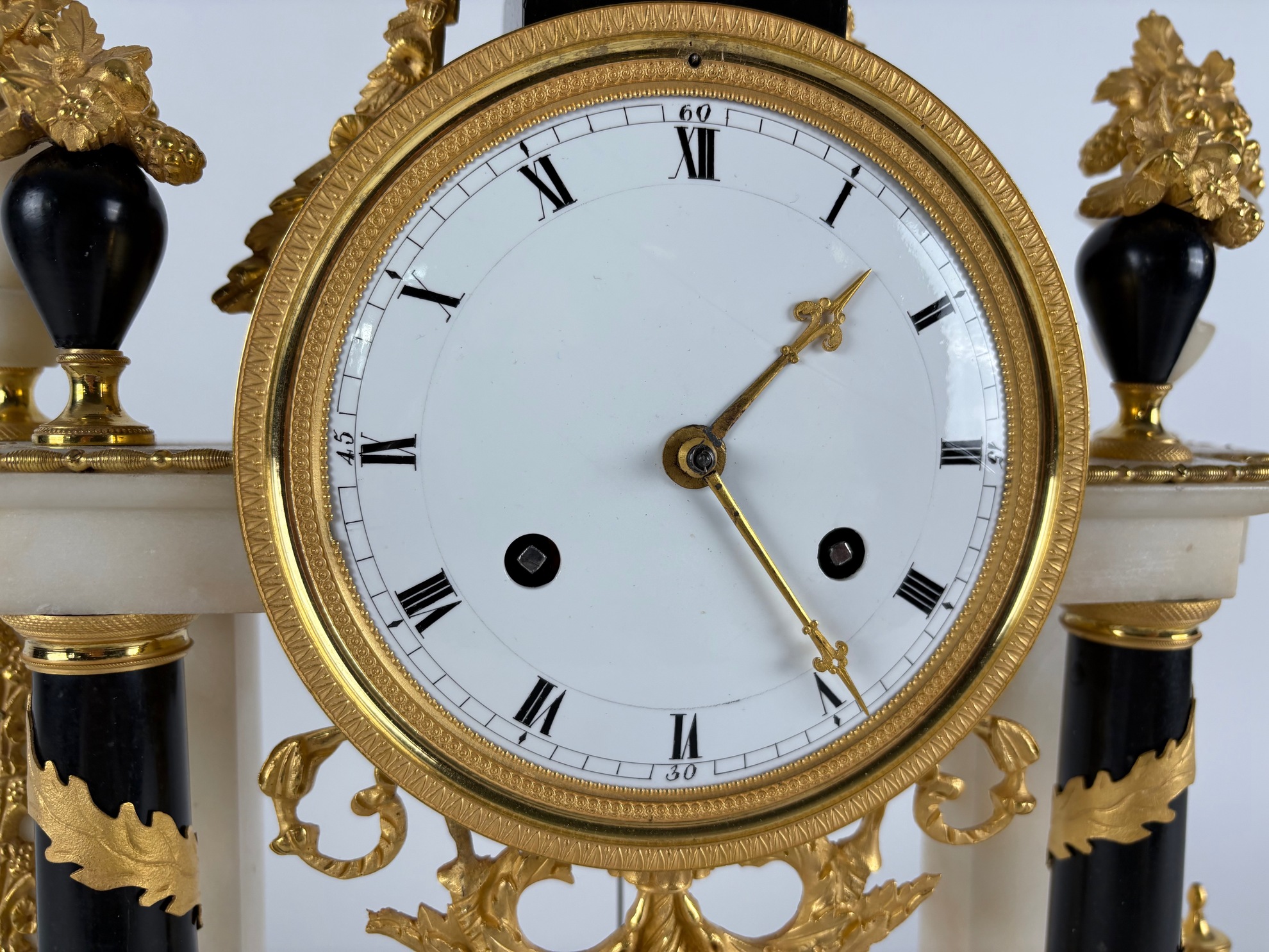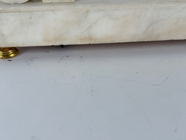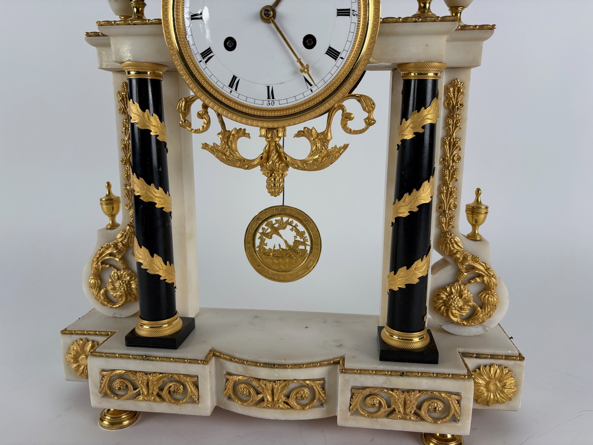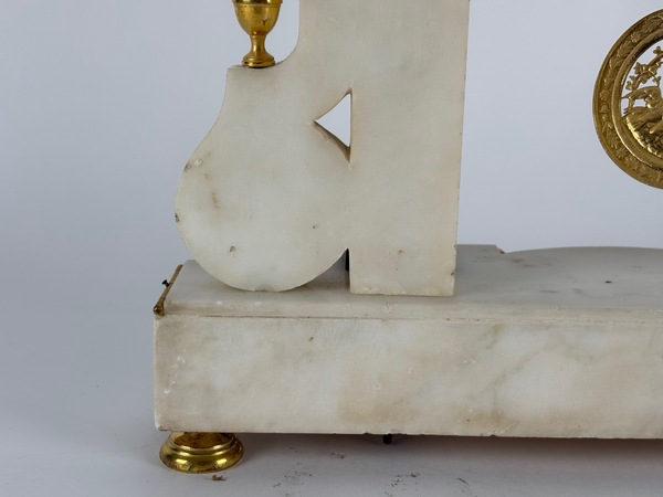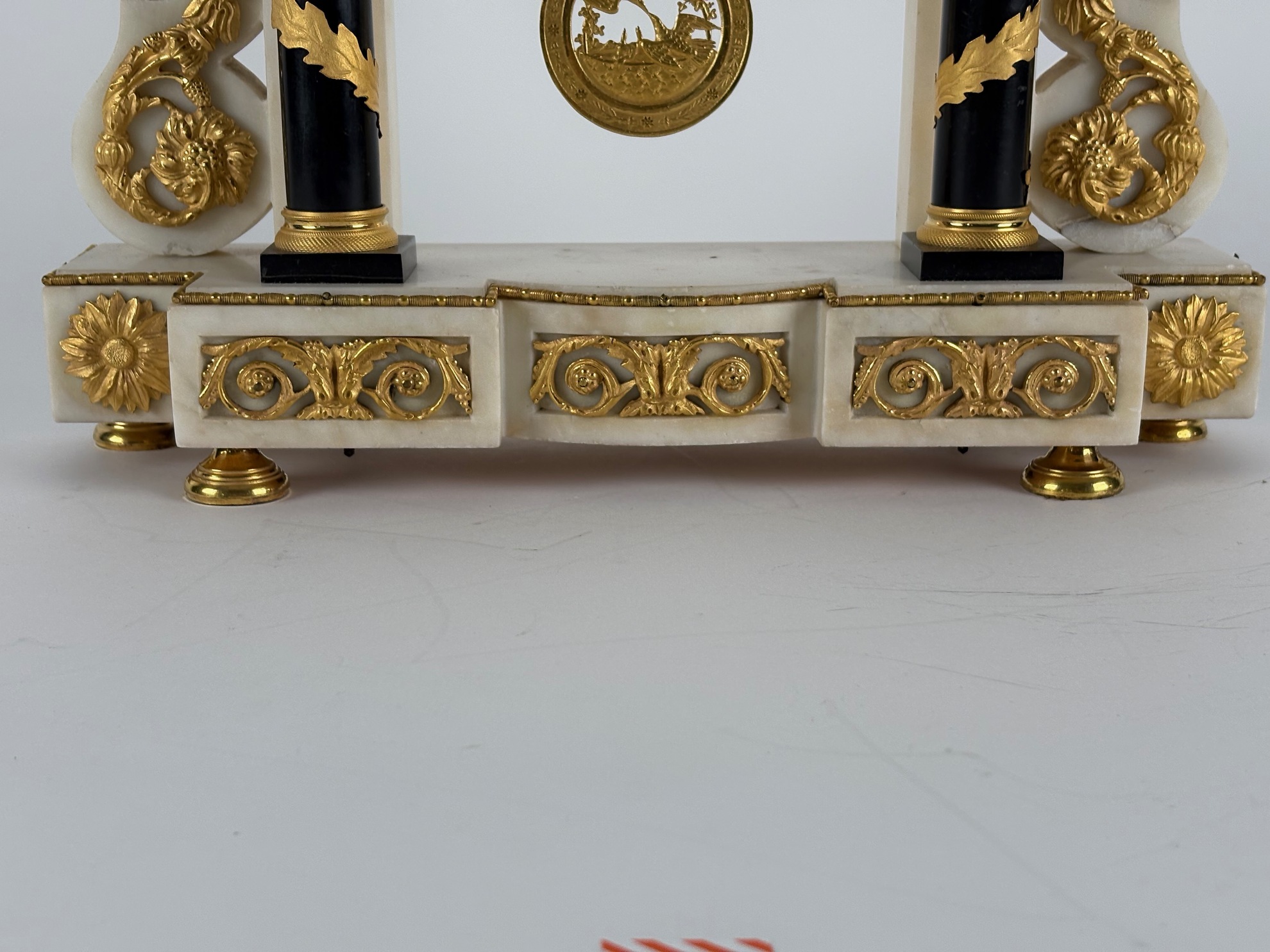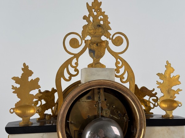 Materials: The clock is made of white marble and gilded bronze (bronze doré), which gives it a luxurious look.