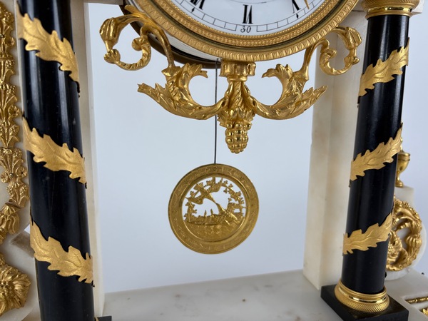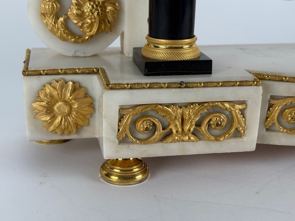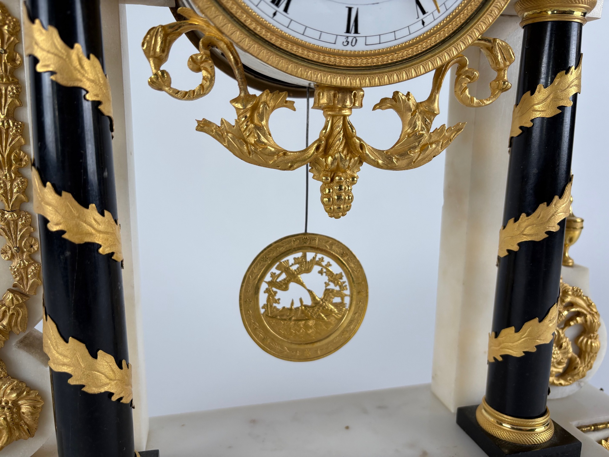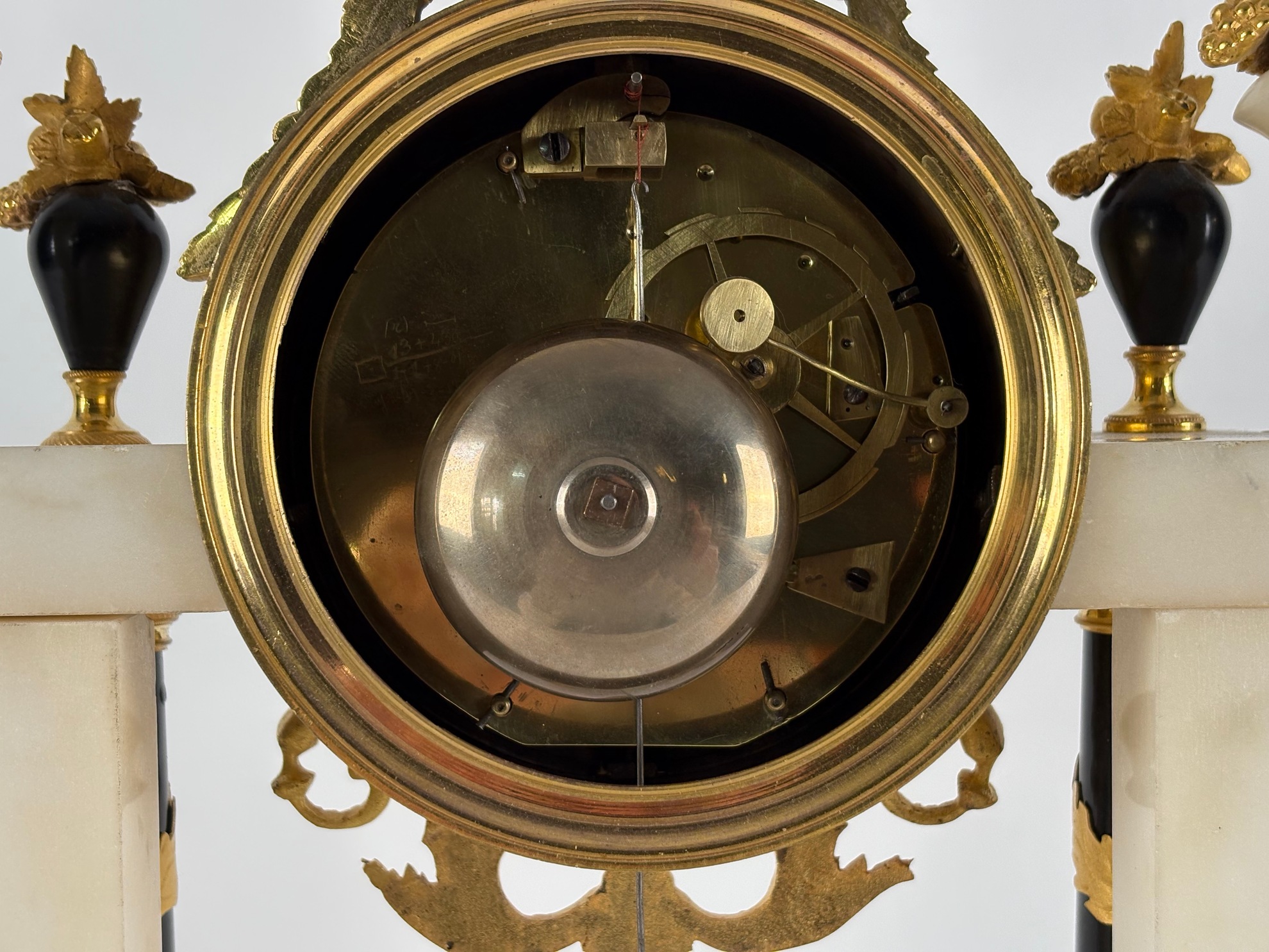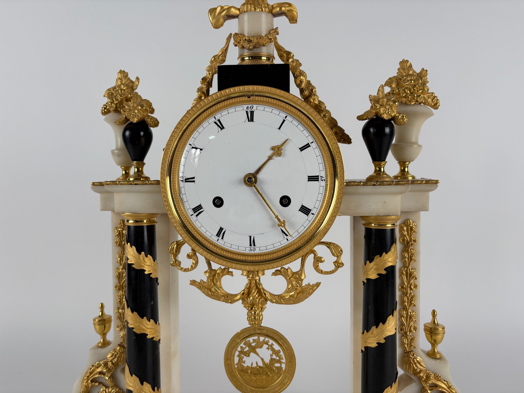 Materials: The clock is made of white marble and gilded bronze (bronze doré), which gives it a luxurious look.