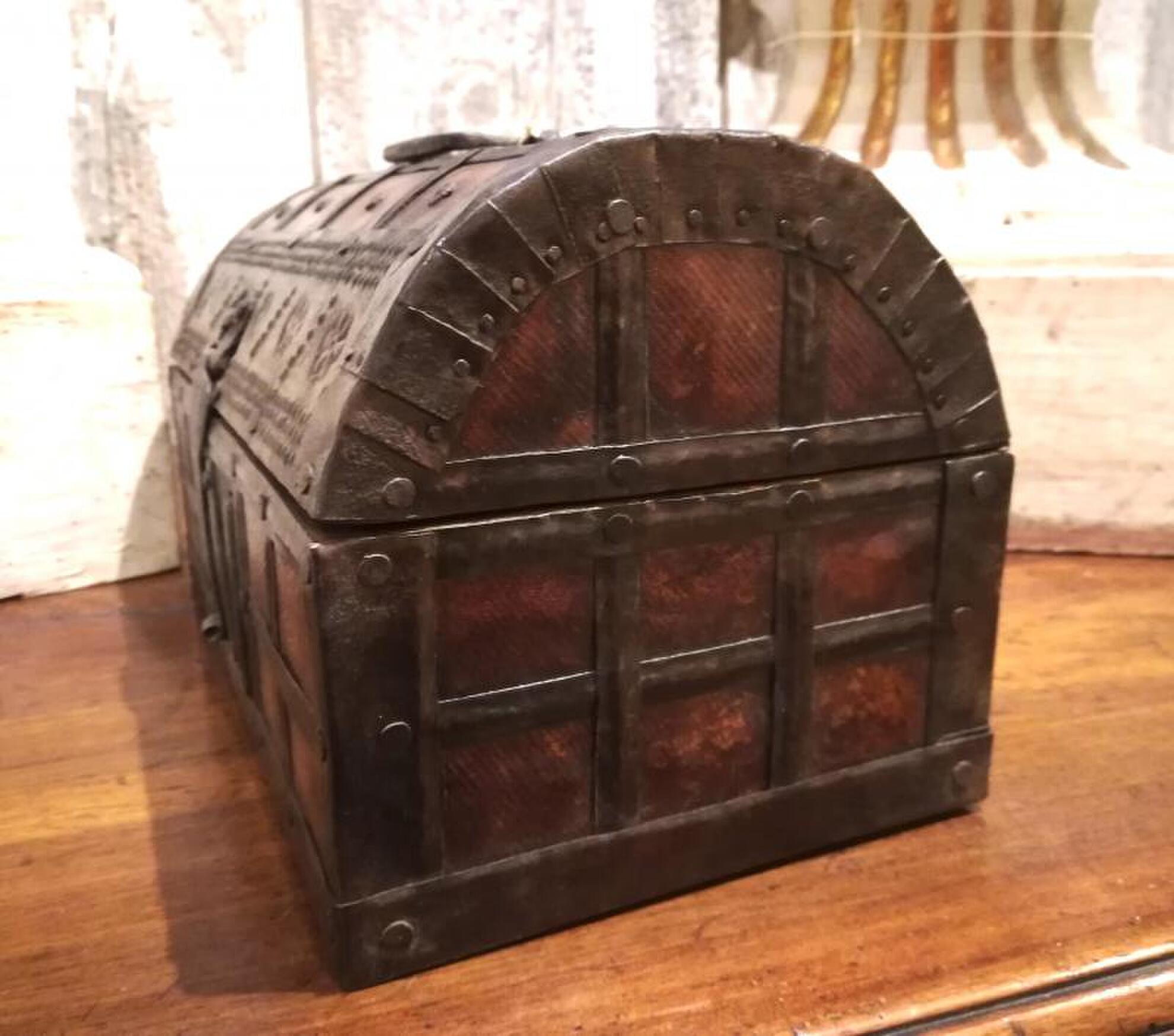 Hasp closure, the keyhole is revealed by rotating an iron paste and handle on the domed lid.