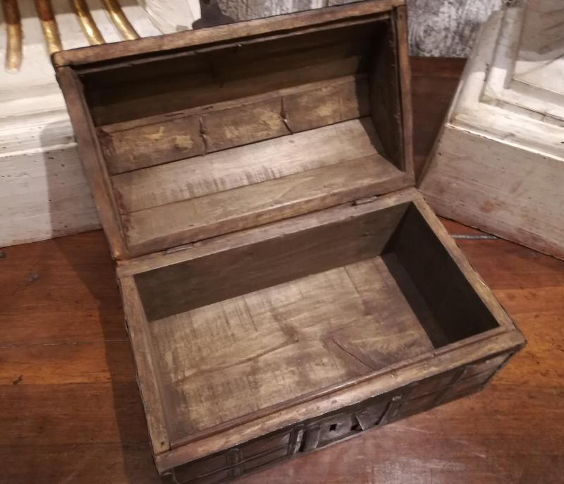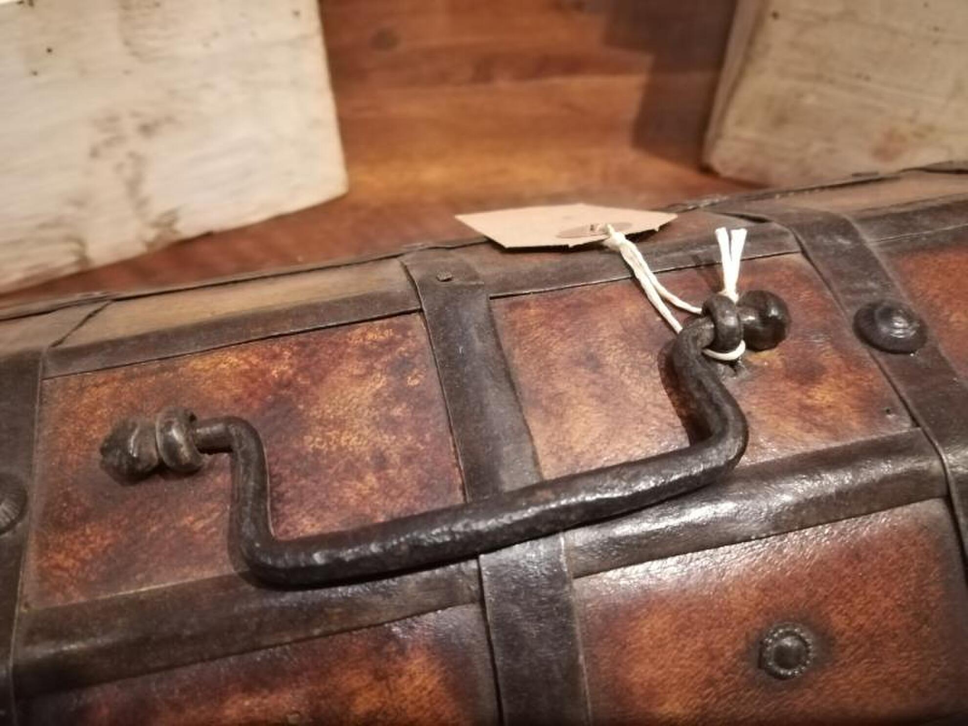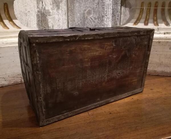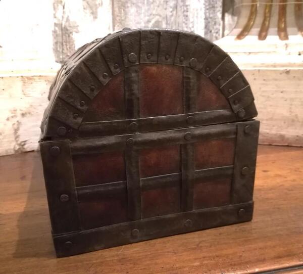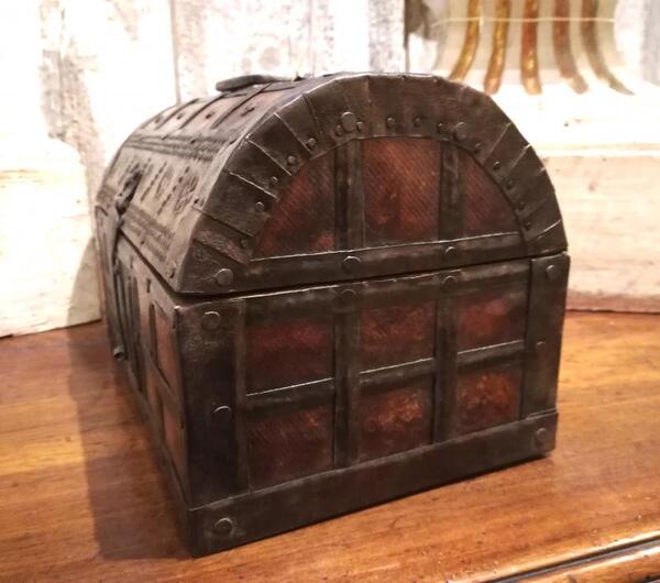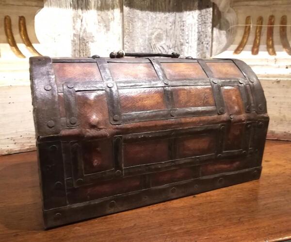 "High Period XVIIth Century Box", called "messenger" Exterior trimmed with leather on wood core and iron hinges.