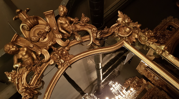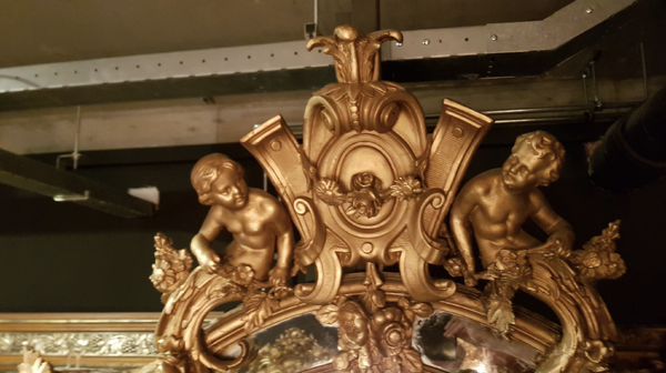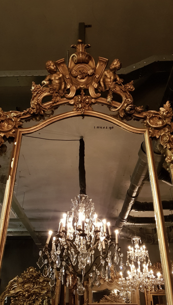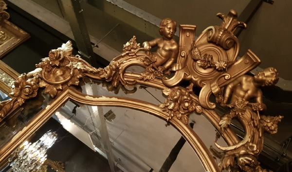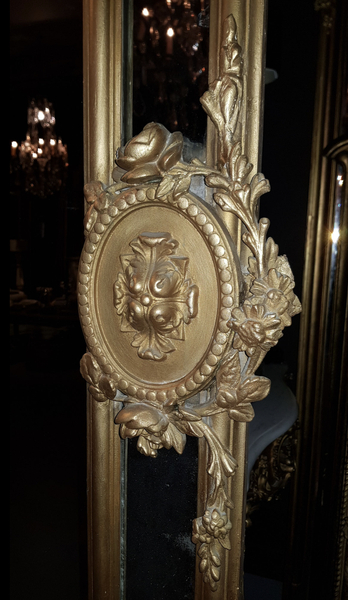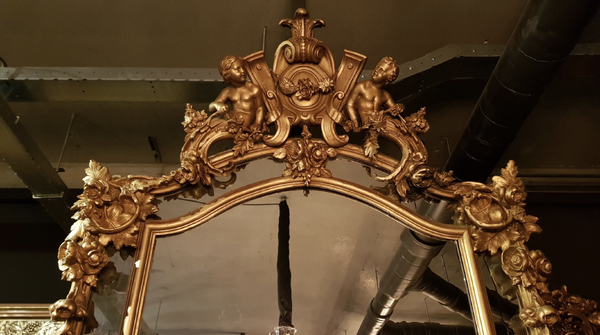A unique piece full of character: the small bevelled mirror panels still contain the original antique glass. The central large mirror pane has been replaced at a later date. The frame is beautifully decorated with two imposing rosettes at its center, adding an extra touch of grandeur.