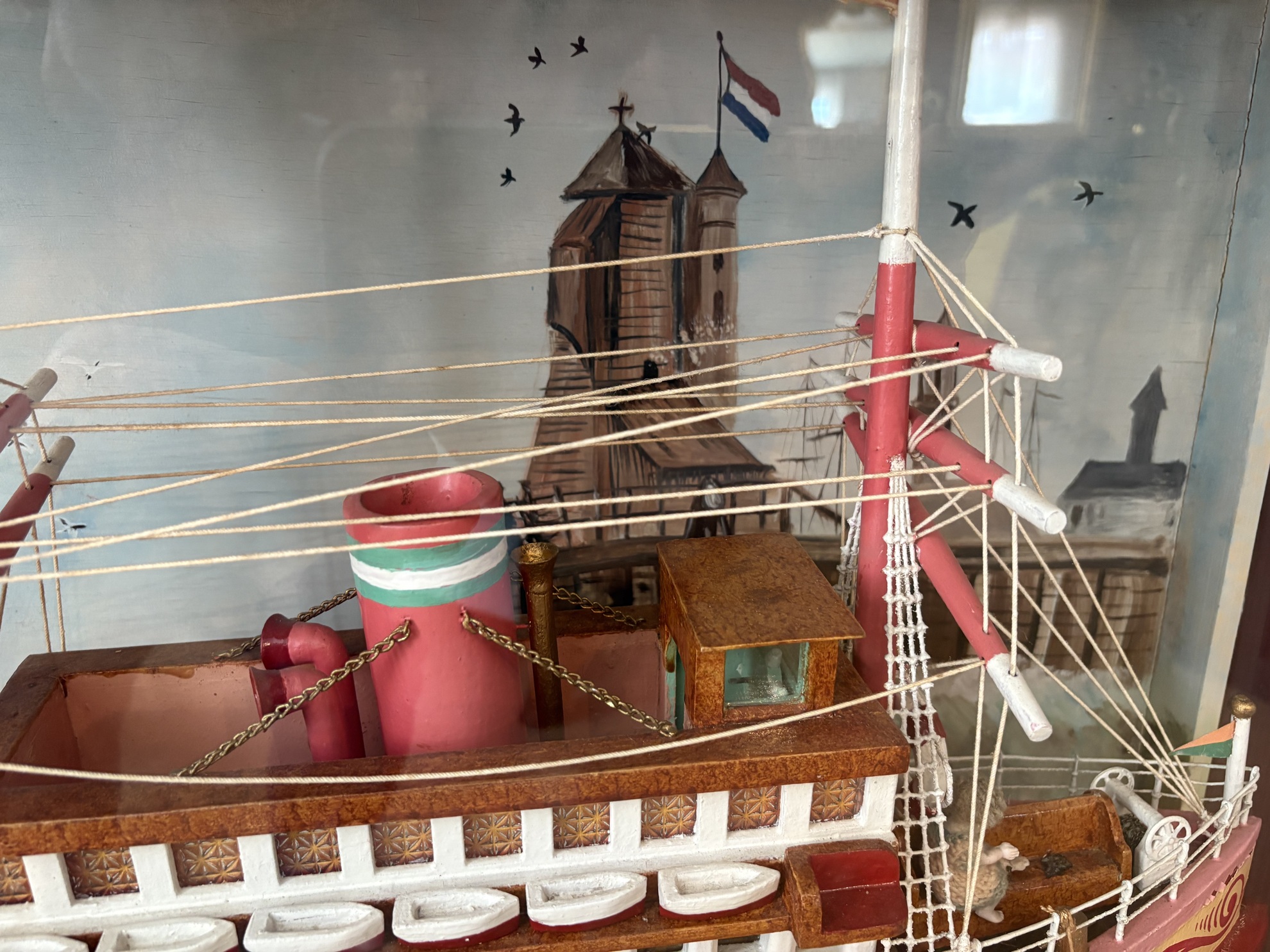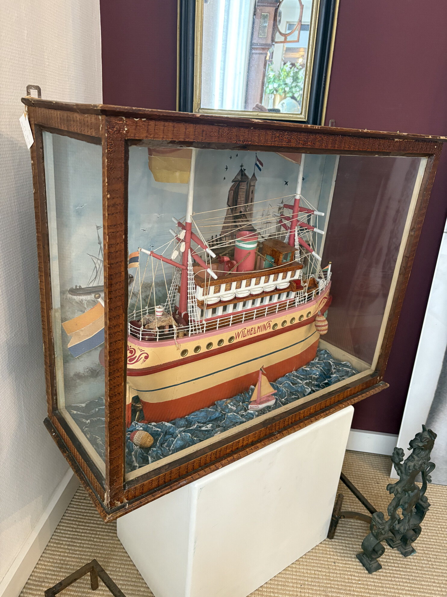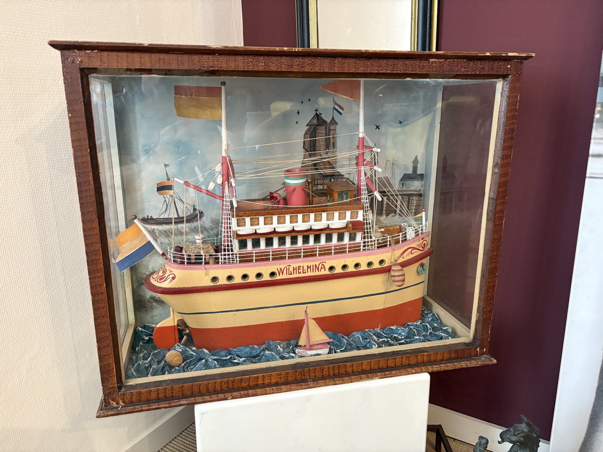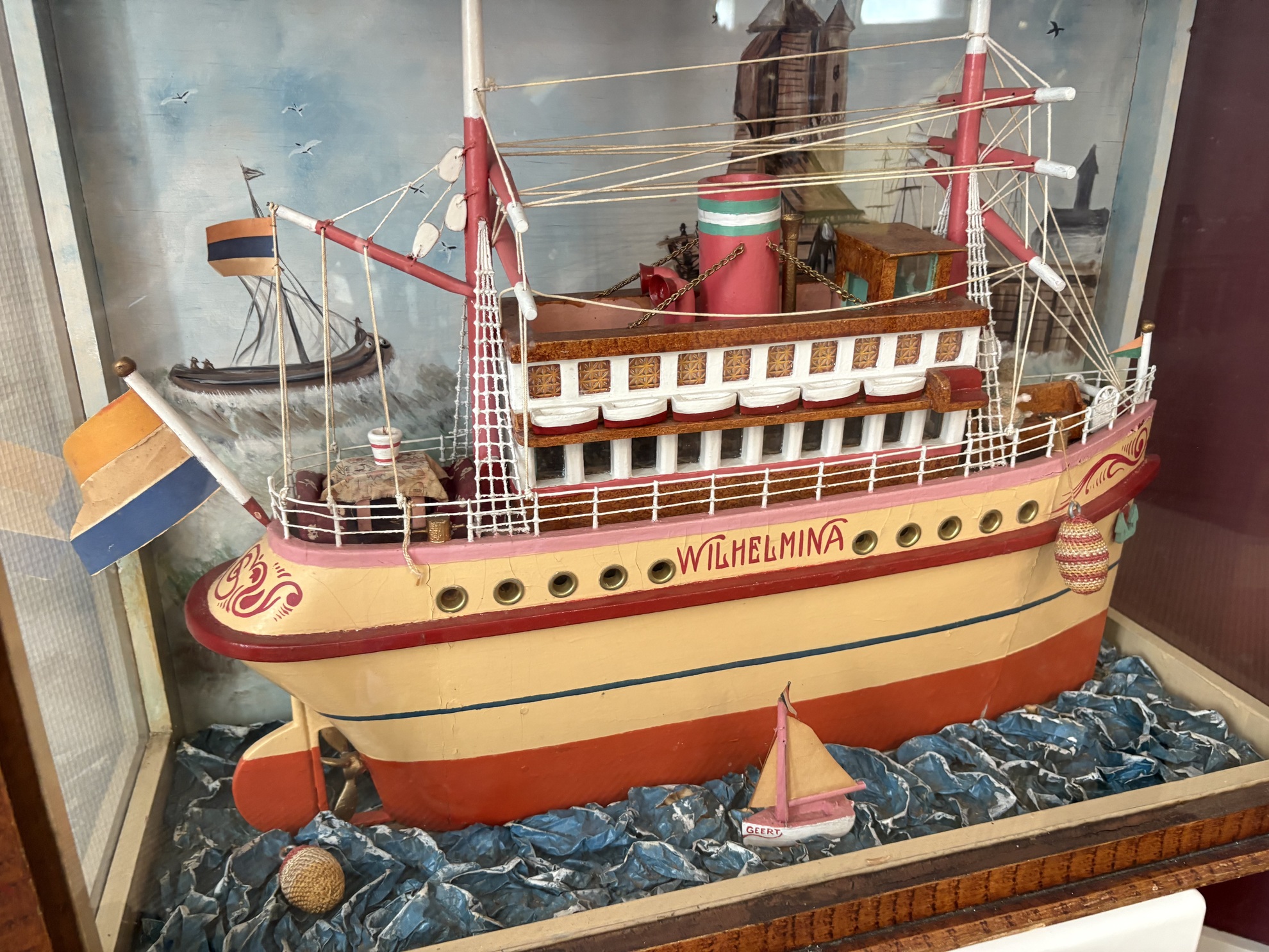 vintage diorama featuring a handcrafted model ship named "WILHELMINA", displayed inside a wooden showcase with glass sides. The scene shows a colorful passenger ship sailing on a stylized blue "sea," accompanied by a small sailboat named “GEERT” and a hand-painted harbor backdrop featuring Dutch flags and church towers.